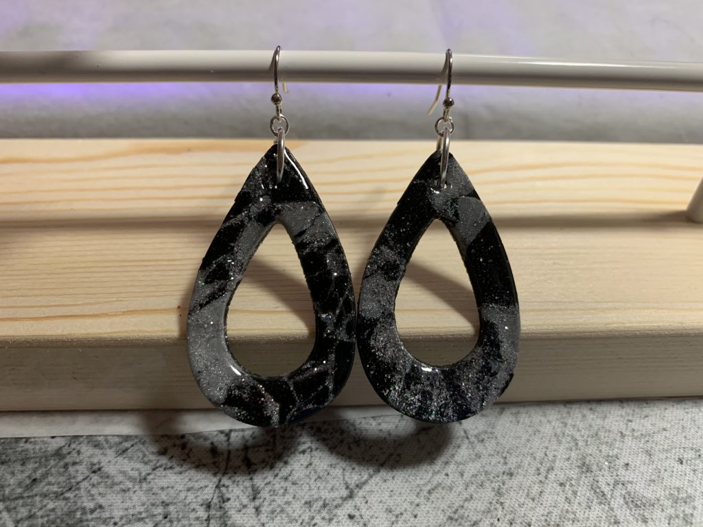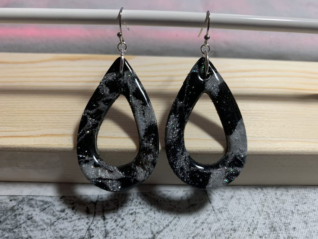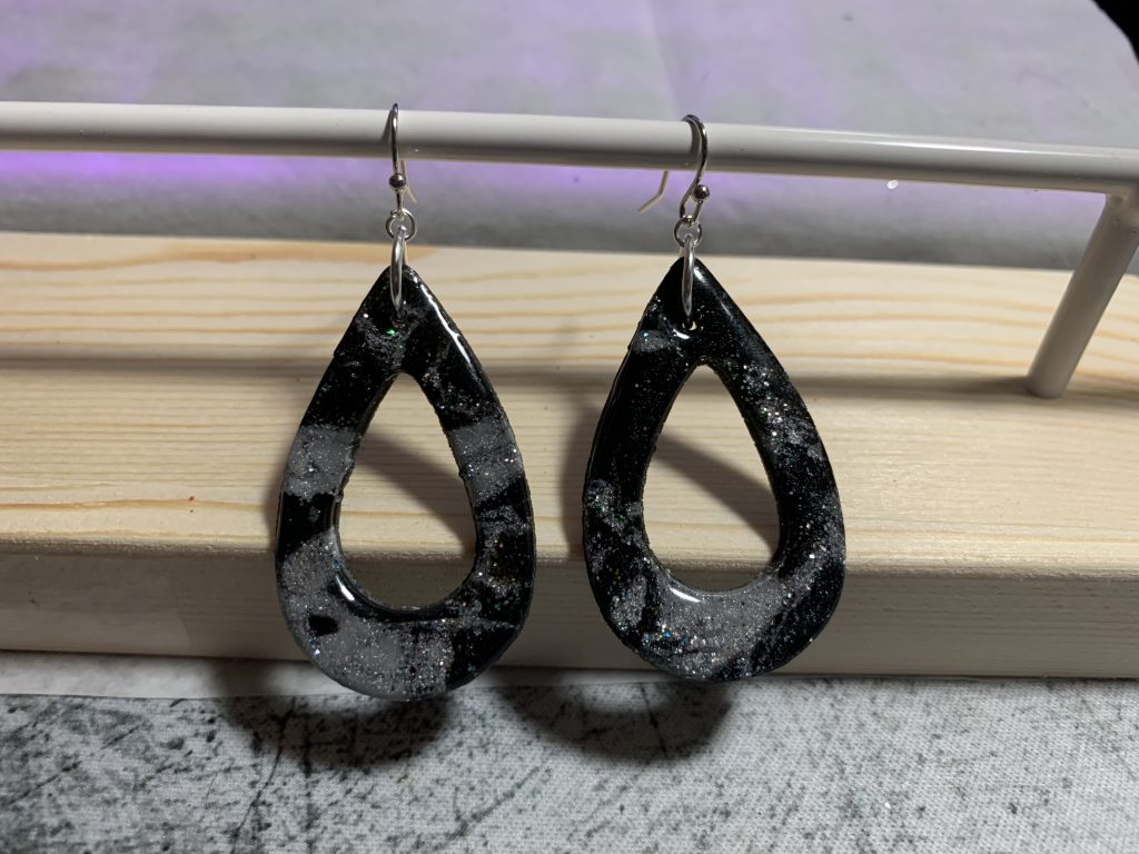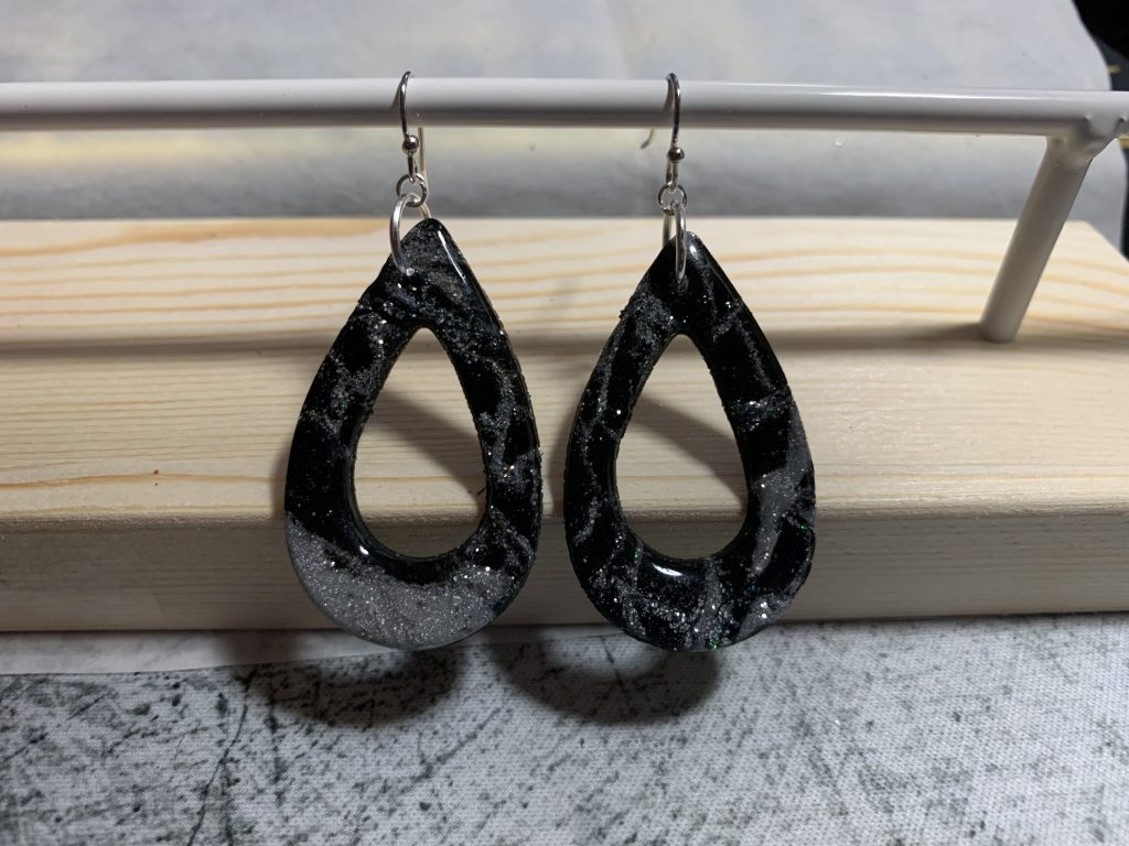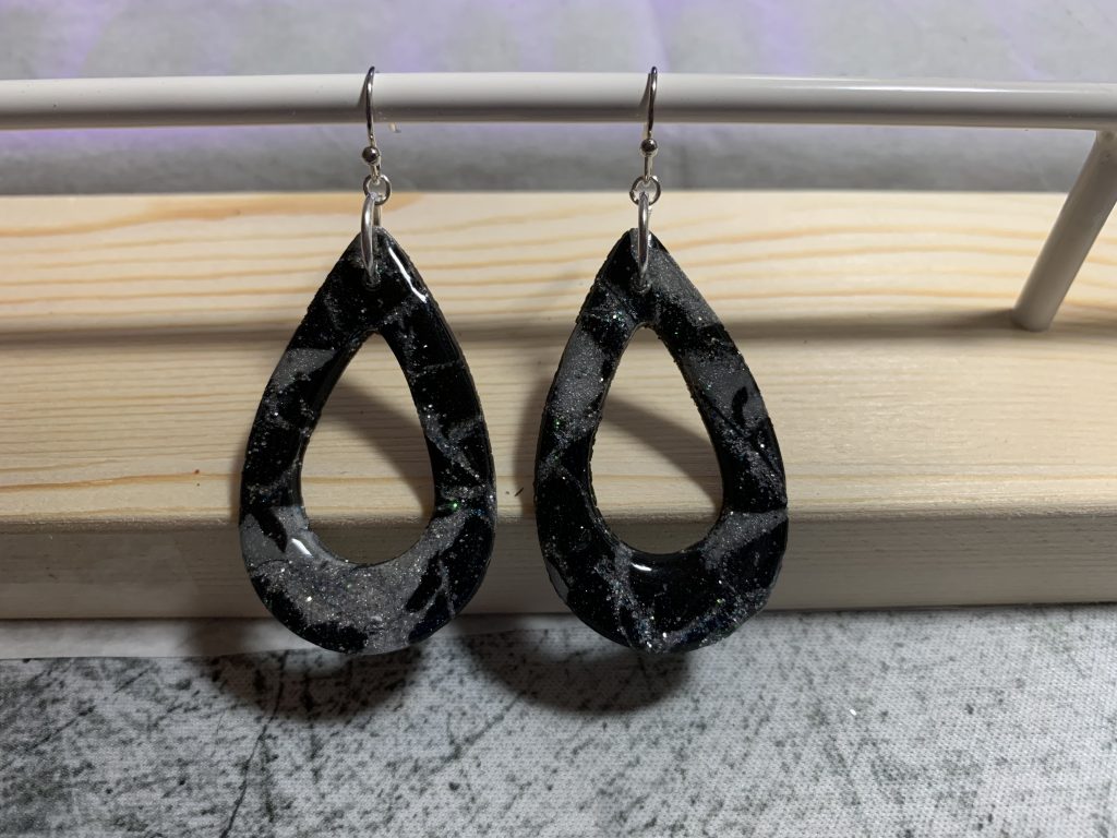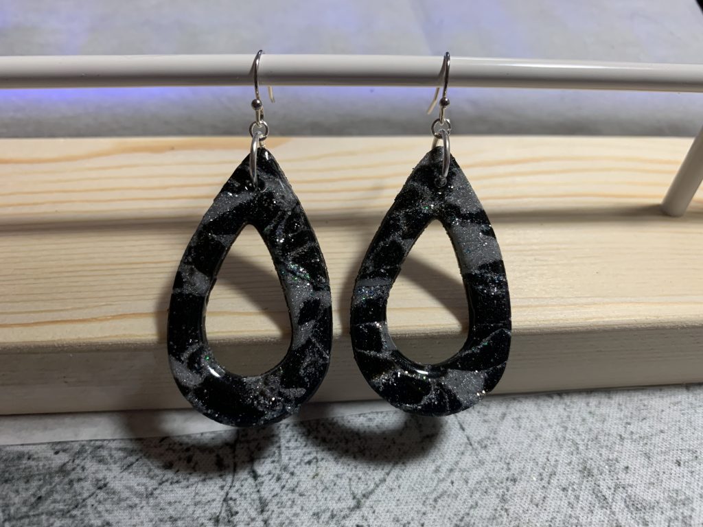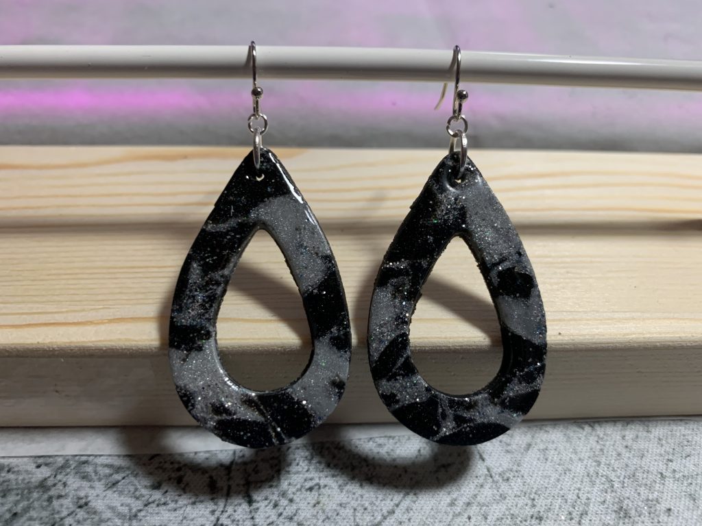 This is the first full set of earrings I made that were all the same shape. These are a base of black polymer clay and silver glitter clay with silver sparkles as the add in. Some of these have already sold and I will be updating the page after I finish my inventory.