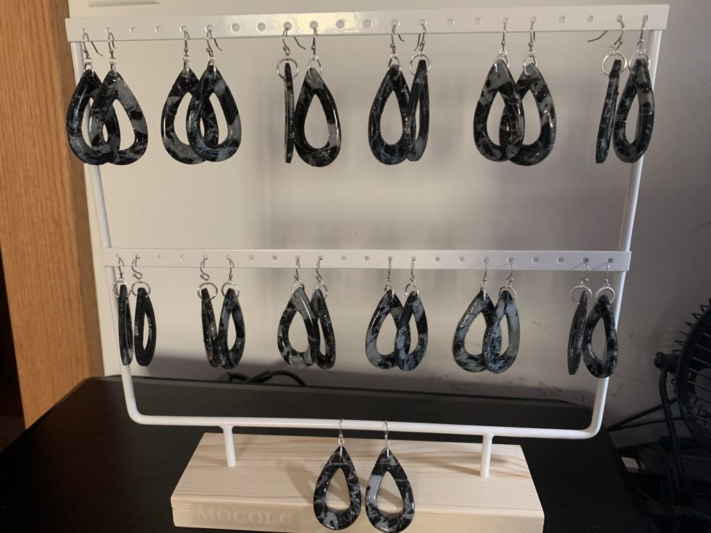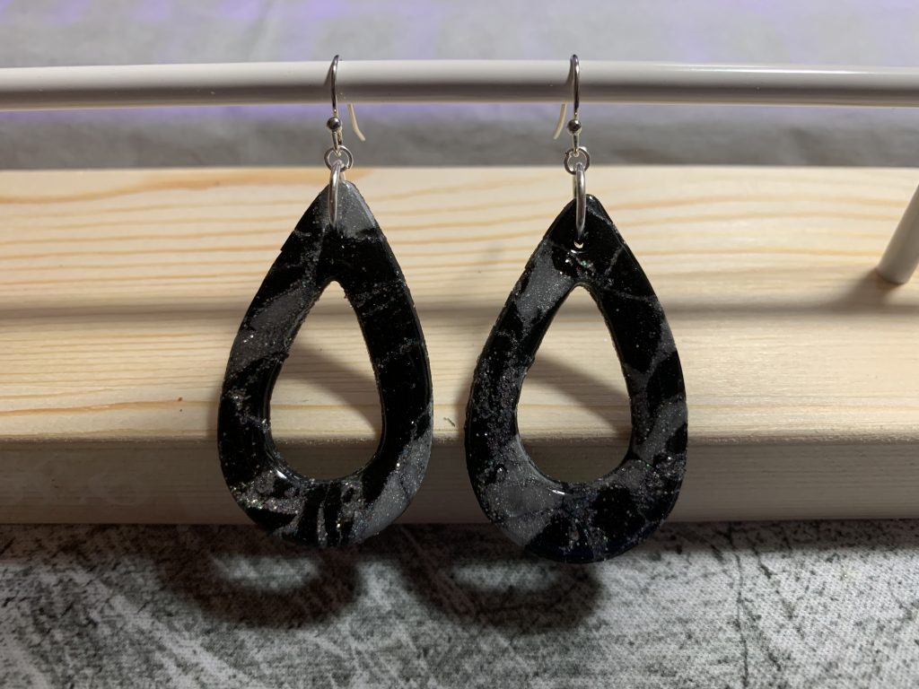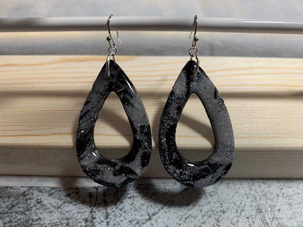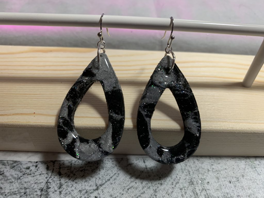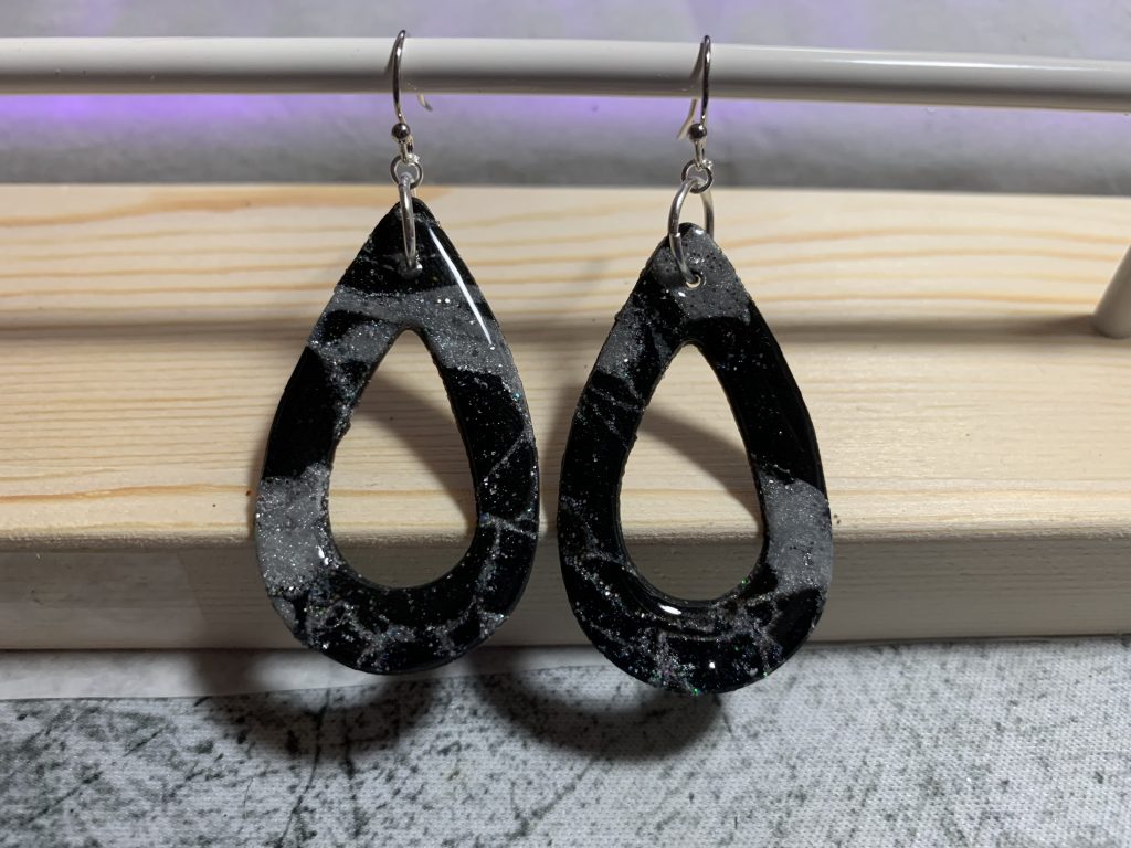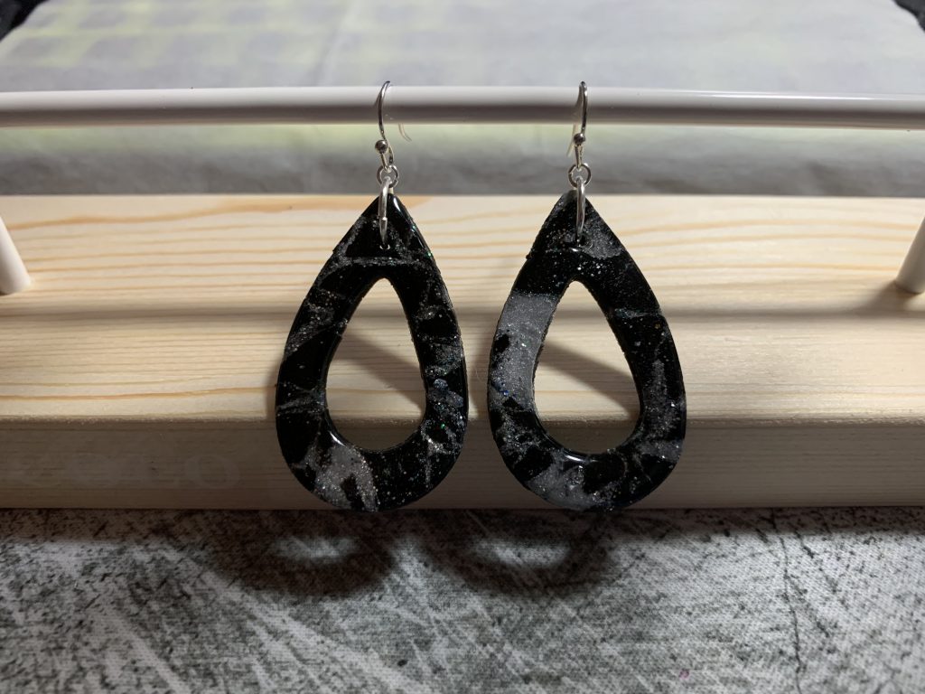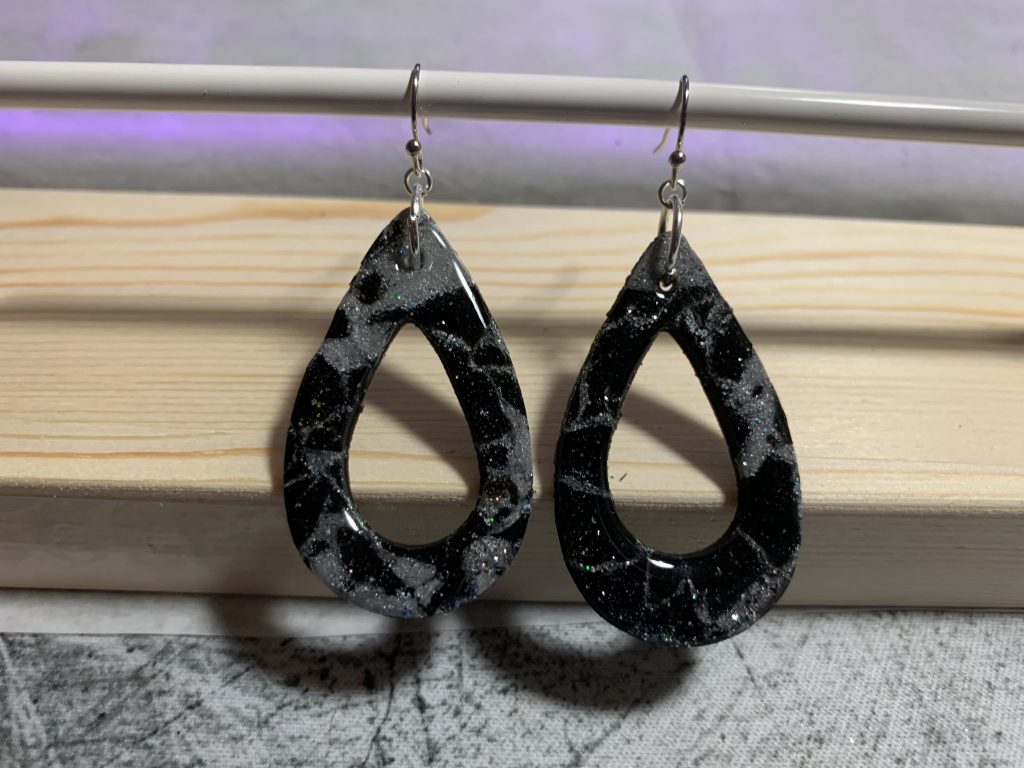 This is the first full set of earrings I made that were all the same shape. These are a base of black polymer clay and silver glitter clay with silver sparkles as the add in. Some of these have already sold and I will be updating the page after I finish my inventory.